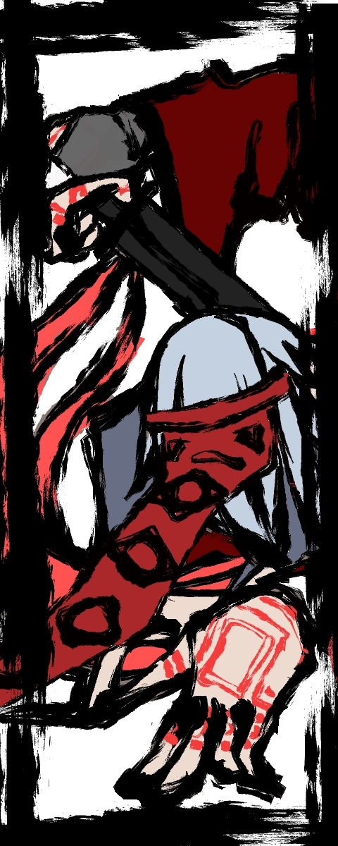 顔は一切見えず、たらされる布に描かれた目だけが向いている