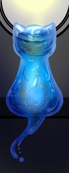 (水のような猫は首を傾げている)