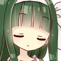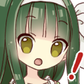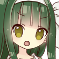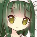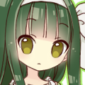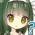 深い緑色の長い髪型に、フリルの装飾の多いワンピースを着ている。