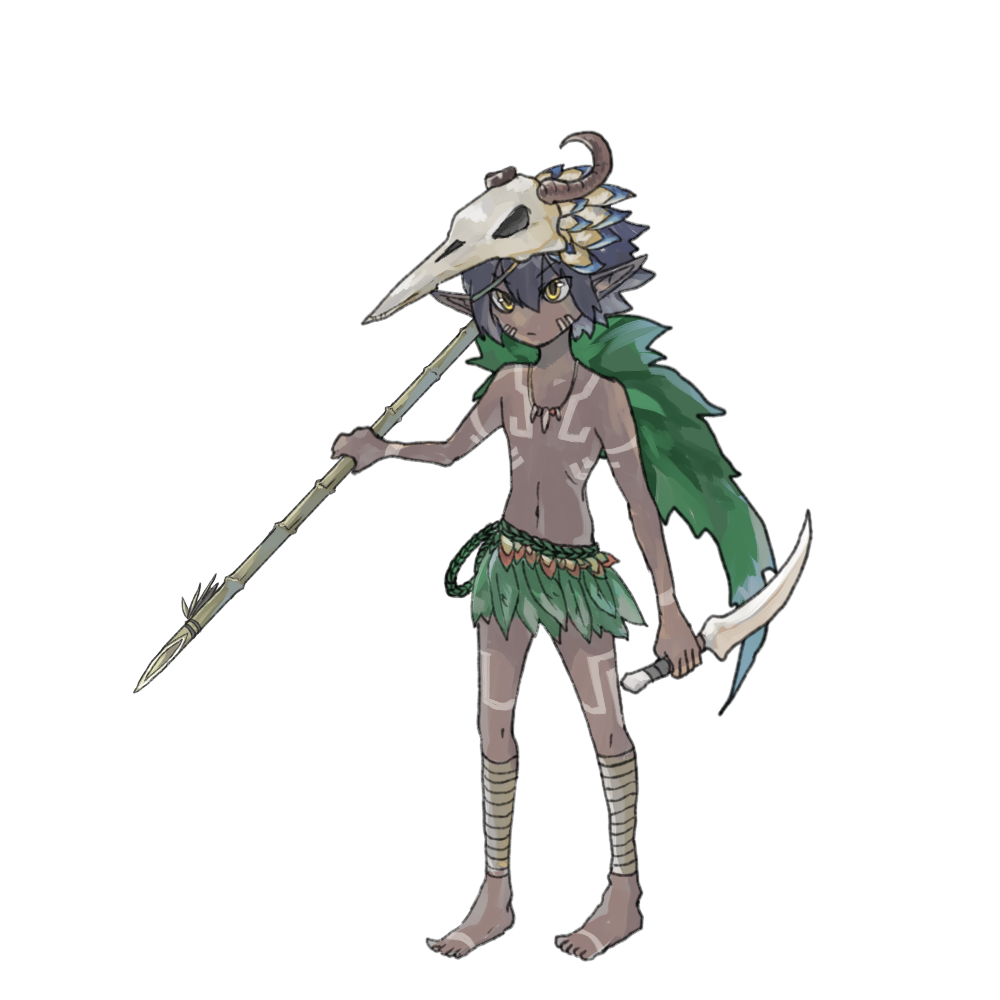 集落に伝わる手製の武器や独特な装束を身にまとっている。
