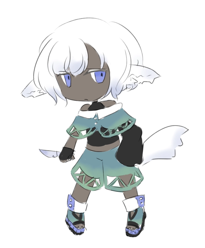 黒肌に白毛の耳と尾を持つ。口を開けば牙めいた八重歯。