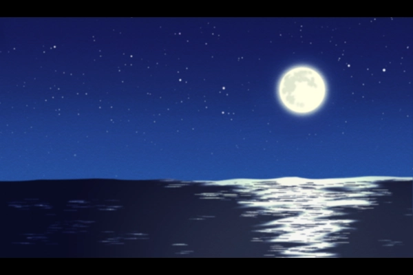 夜の海を見おろす。遠く、丸く満ちた明るい月。