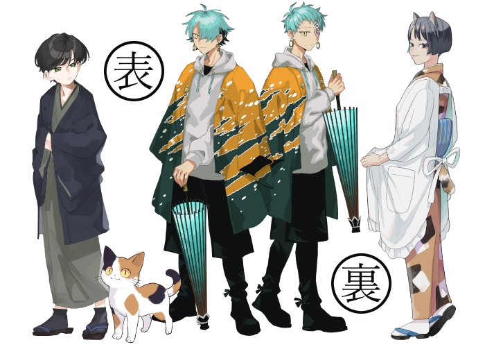 波飛沫のような独特の模様で染められた羽織に、浅葱と紺色に染めたくせっ毛、同色の傘がトレードマーク。
