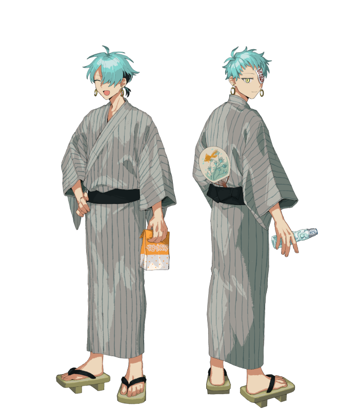 片目には護符が貼られ、眼付きは鋭く、髪は短くなっている他、口調の訛りもなくなる等の微妙な違いがある。