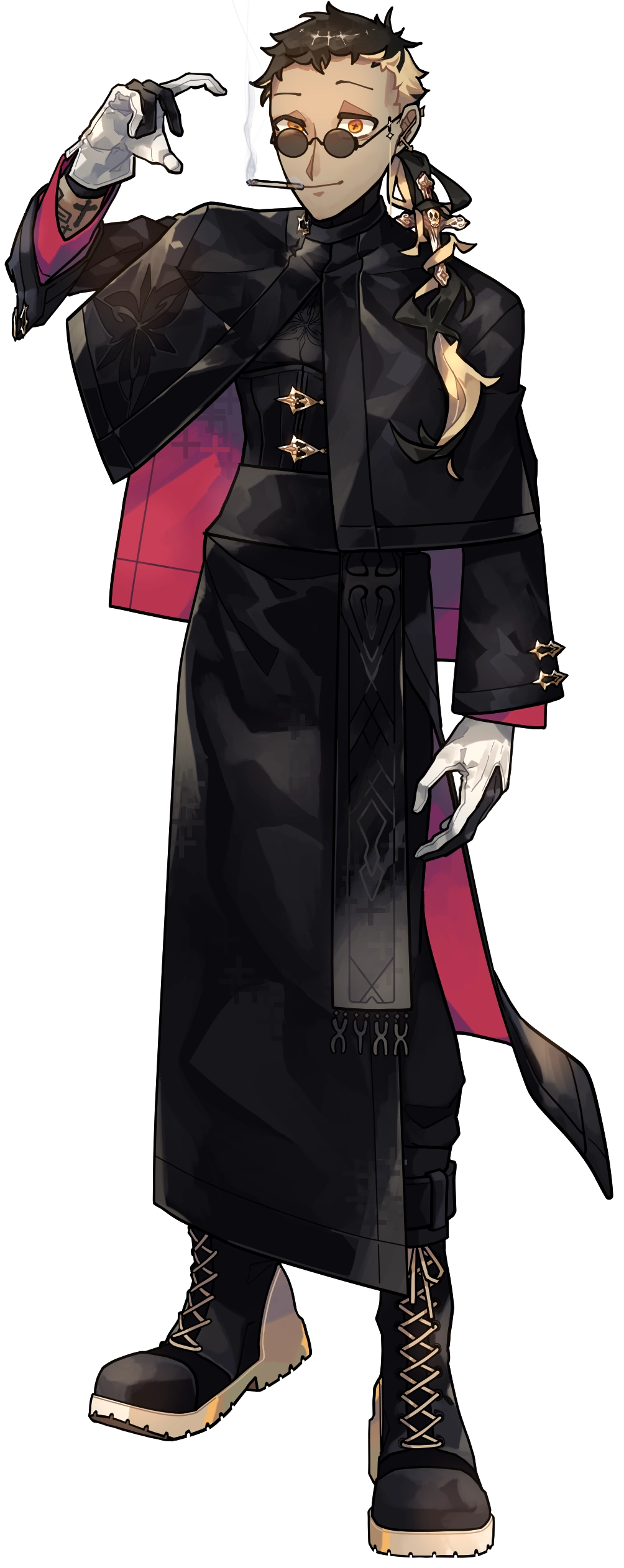 ノーブル会の校章が入った立派な神父服。まれにその袖口から腕に刻まれた十字架のタトゥーがいくつか見えるかもしれない