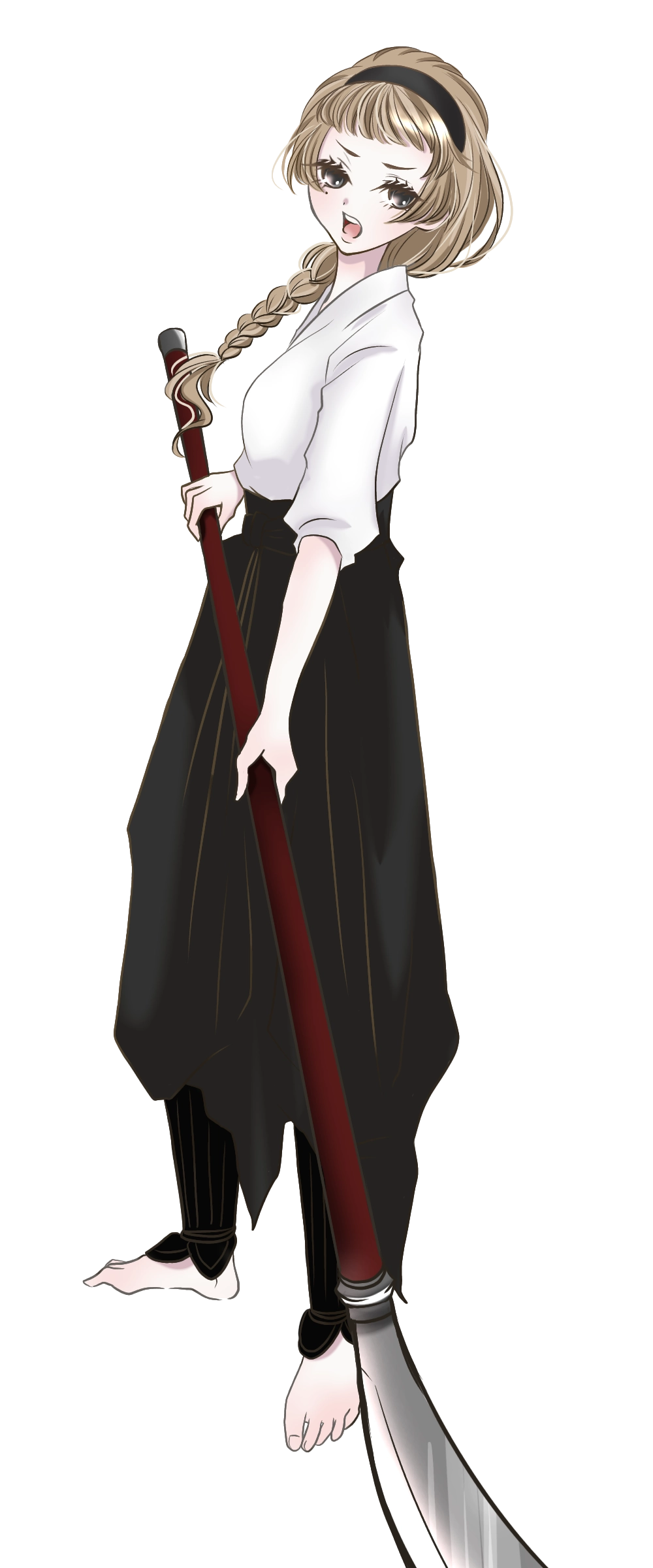 切先が強く反った女薙刀。明け方の空のような緋色の刀身と長柄。長さ2.15m。