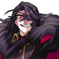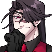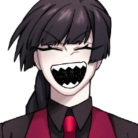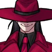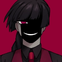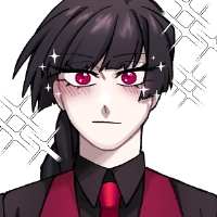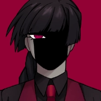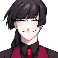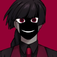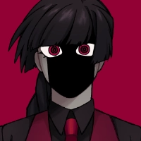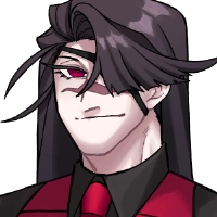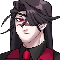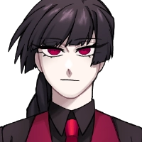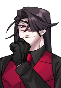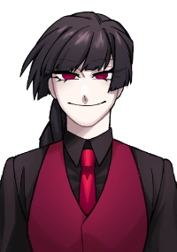 黒のワイシャツに、血のような真っ赤な瞳、赤いベストとネクタイが特徴的。
