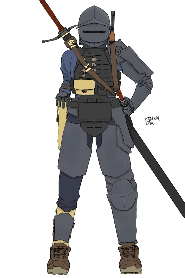 四肢周りの古めかしい鎧に反して、胴体は現代的な軍用アーマーキャリアを着こんでおり、腰回り、首周り、左わき腹を守るグローインアーマーを装着しているほか、スイマーズカットとよばれる動きやすさ重視の防弾プレートが挿入されている。靴は一見するとただの登山靴だが、中に踏み抜き防止の鋼板が入っているなど防御性能も考えられている。