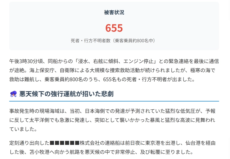 「浸水が止まらない。エンジンが停止した。右舷に大きく傾斜している」その後通信途絶。船長も含め乗組員はほぼ全員が犠牲に。