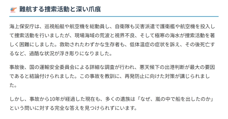 【特集】連絡船転覆事故から10年。755名が犠牲となった海難事故を振り返り、再発防止への取り組みを検証します。