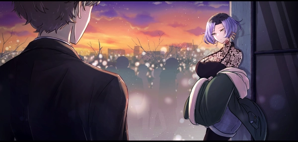 建物の壁に寄りかかりながら腕を組んでこちらを真っ直ぐに見ている。