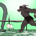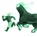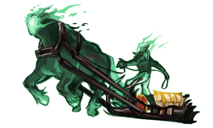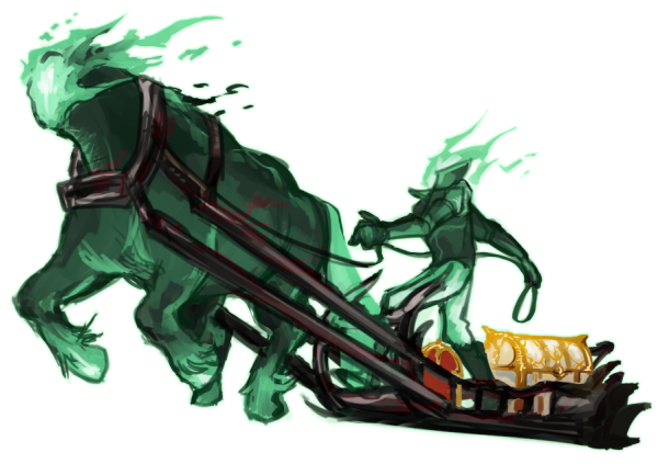 ソリを引く大きな首無し馬『バンバ』と、それを駆る首無し御者のタッグ。所謂デュラハン。