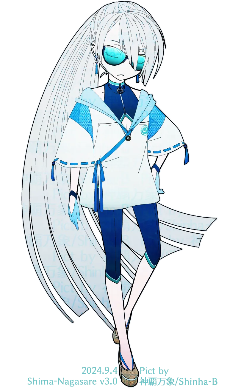 容姿:髪留めで一括りにされた青緑がかった白銀のストレート長髪,