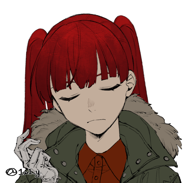 赤紫の切り揃えた前、二つ結びの髪